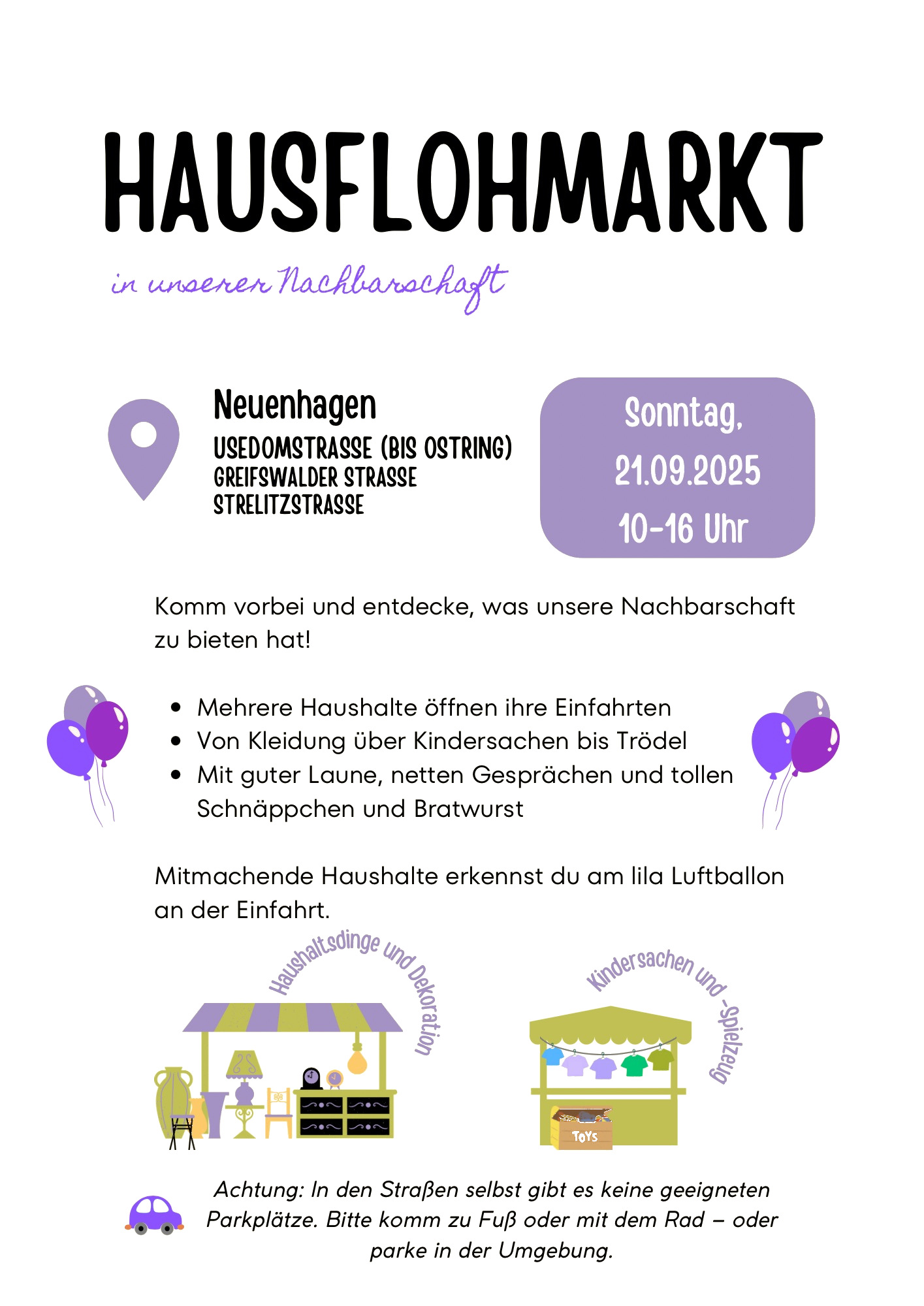 Wie erkenne ich die Stände? → An den lila Luftballons an der Einfahrt.